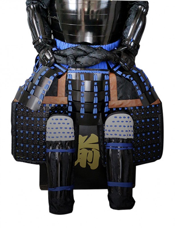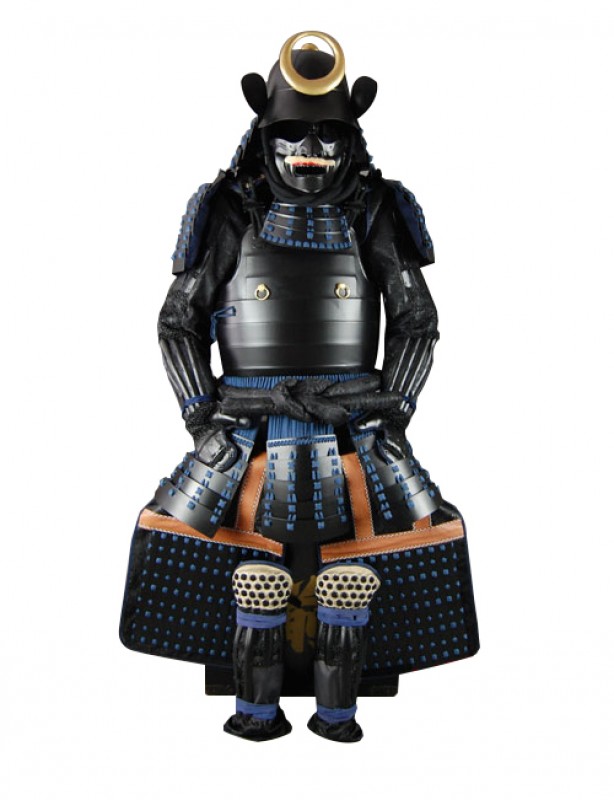 Livrée complète : kabuto(casque), menpo (masque) et suneate (tibia) et présentoir pour yoroi.
