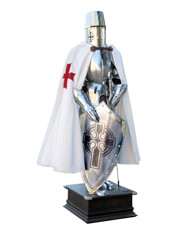 Armure Templiers de décoration avec épée, cape avec croix pattée rouge et bouclier.