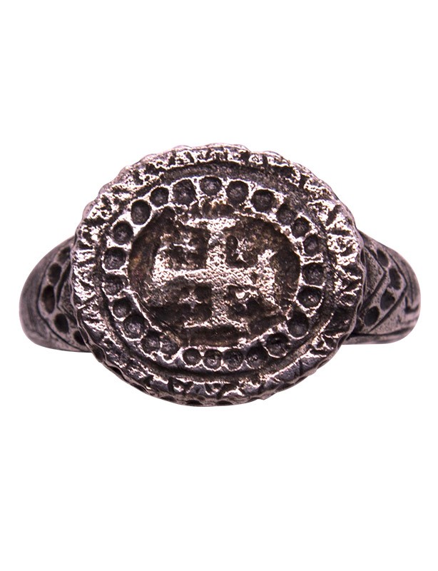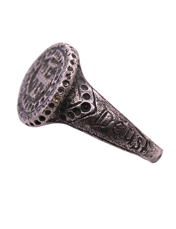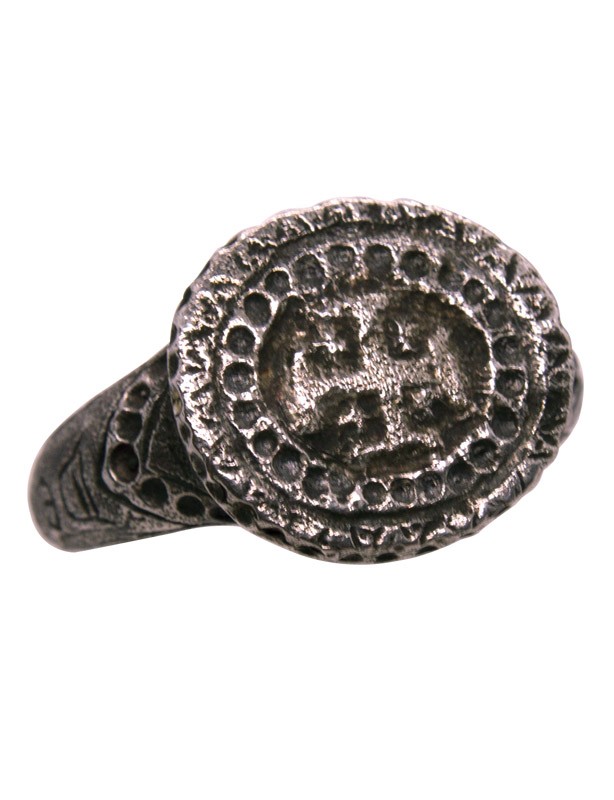 Réplique en argent massif de chevalière du XIIIème siècle avec croix de Jérusalem et inscription "Deus Vult"