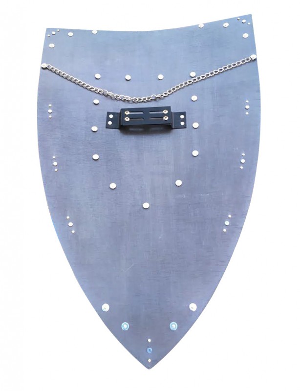 Bouclier en acier avec chaînette derrière pour l'accrocher au mur et passant en métal.