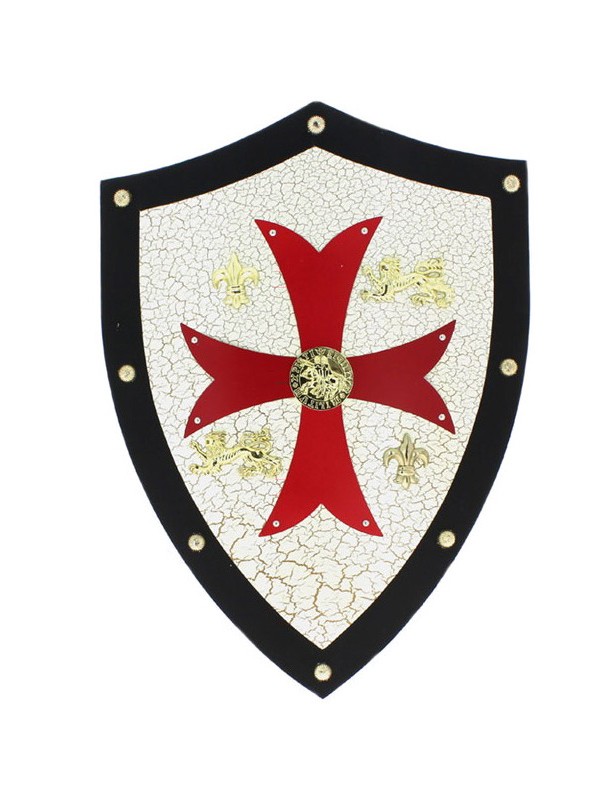 La croix pattée ornant le centre du bouclier est un symbole emblématique des Templiers. Cette croix, aussi connue sous le nom de croix de Malte, est composée de quatre bras égaux qui se terminent par des pointes. Elle incarne la bravoure, la foi et le courage des chevaliers Templiers.