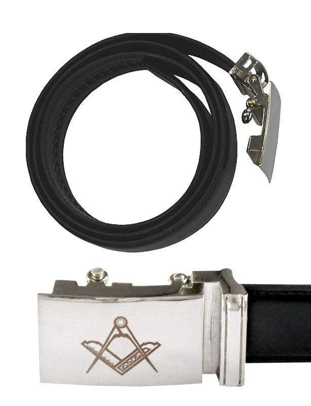 Ceinture en cuir noir, avec boucle gravée équerre compas.