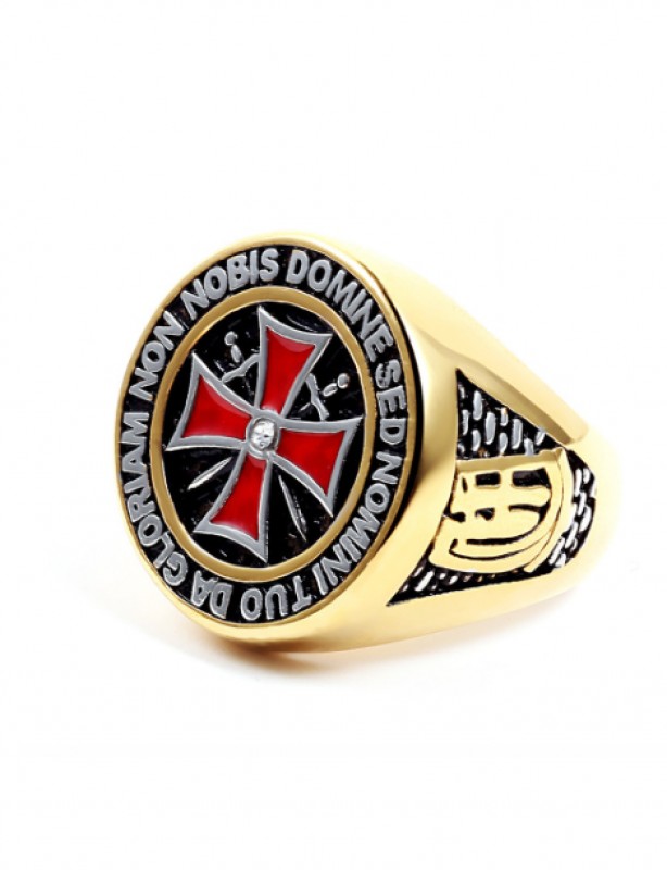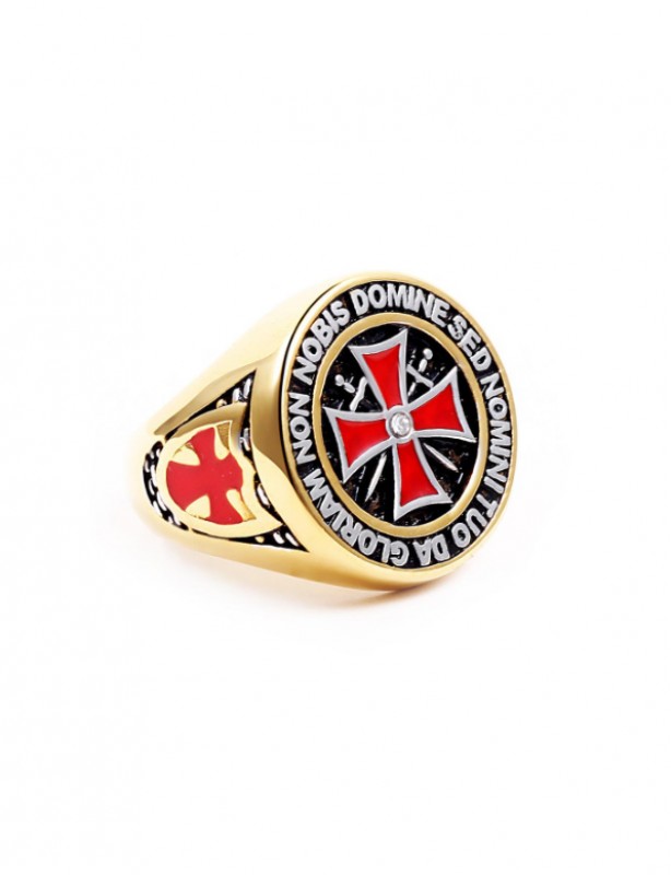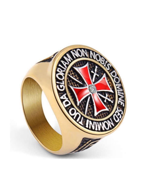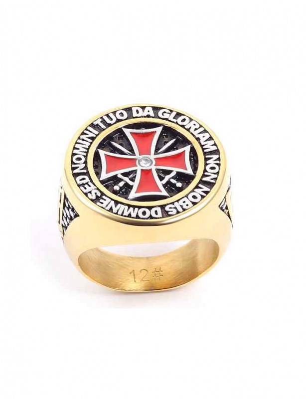 Bague en acier Inoxydable avec croix rouge et phrase de l'ordre des templiers.