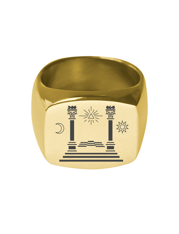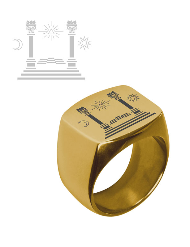 Chevali�re en acier inoxydable dorée, gravée avec différents symboles maçonniques.