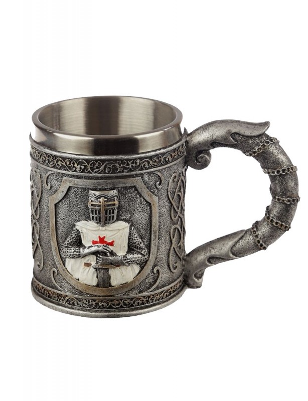 Chope à bière décorée,réalisée en résine. Mug de couleur acier ornée de symboles et d'un chevalier Templier "Croix de saint Jean".