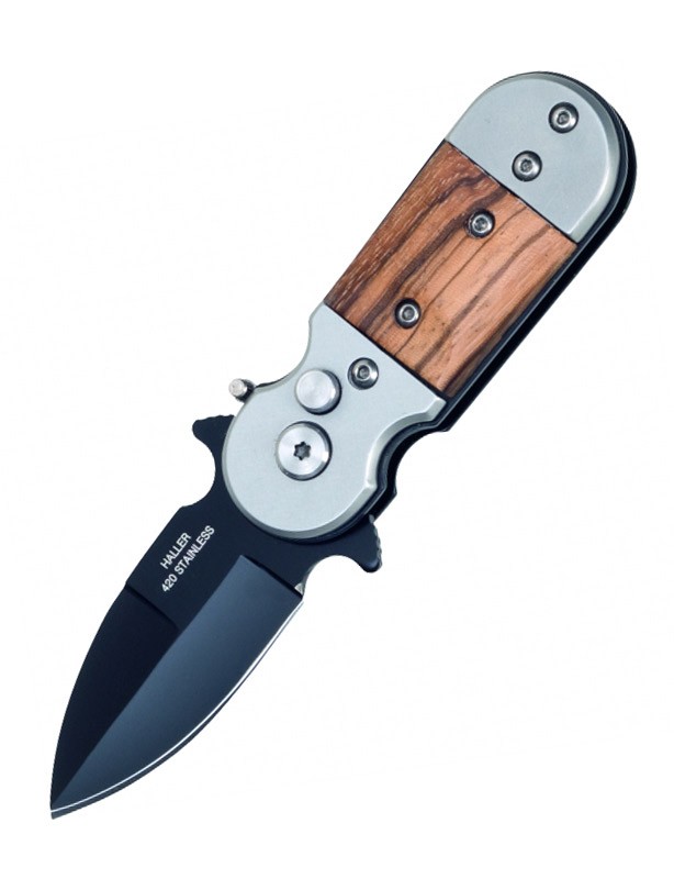 Poignée en métal léger et bois de zebra avec clip permettant le port à la ceinture.