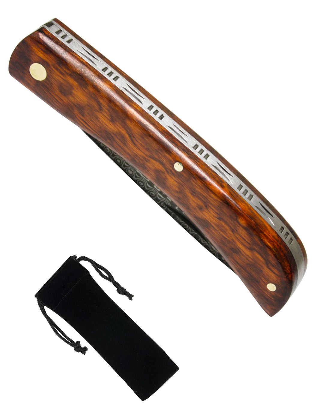 La lame est composée d’un acier de Damas à 71 couches, associé à un noyau en acier inoxydable 8Cr13MoV. Cette structure assure un tranchant efficace, une bonne tenue de coupe et une résistance appréciable à la corrosion. Avec une longueur de 80 mm, la lame offre un excellent compromis entre précision et polyvalence, idéale pour un usage quotidien comme pour les amateurs de coutellerie traditionnelle.