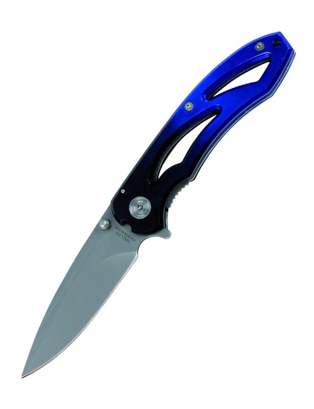 Poignée en métal léger anodisé dans un gradient allant du noir au bleu, avec clip permettant le port à la ceinture.