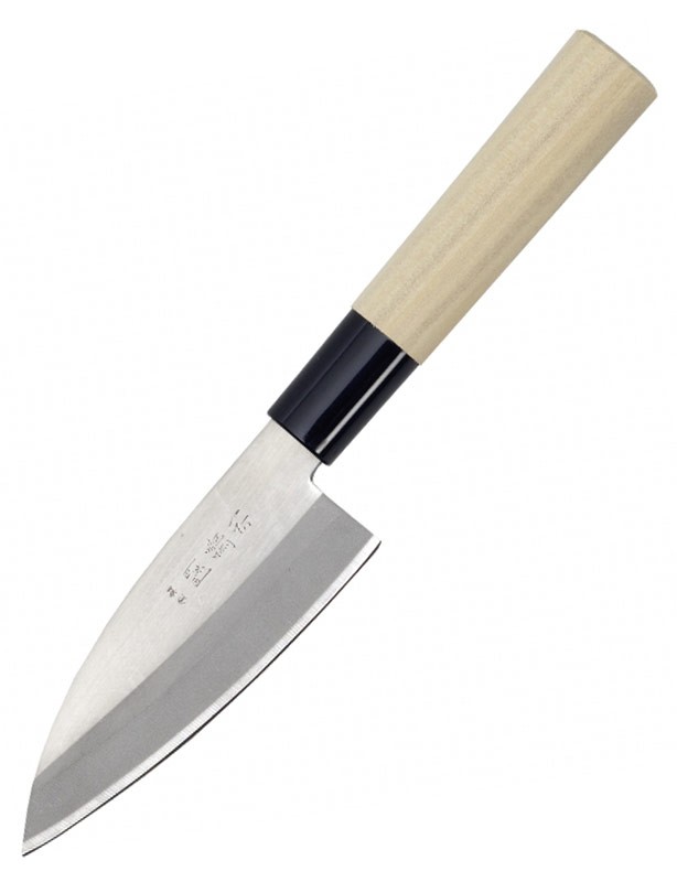 Un petit couteau à portée de main style Deba traditionnel, un côté de la lame plat et l’autre côté est muni d’une pointe biseautée pour une coupe très précise.