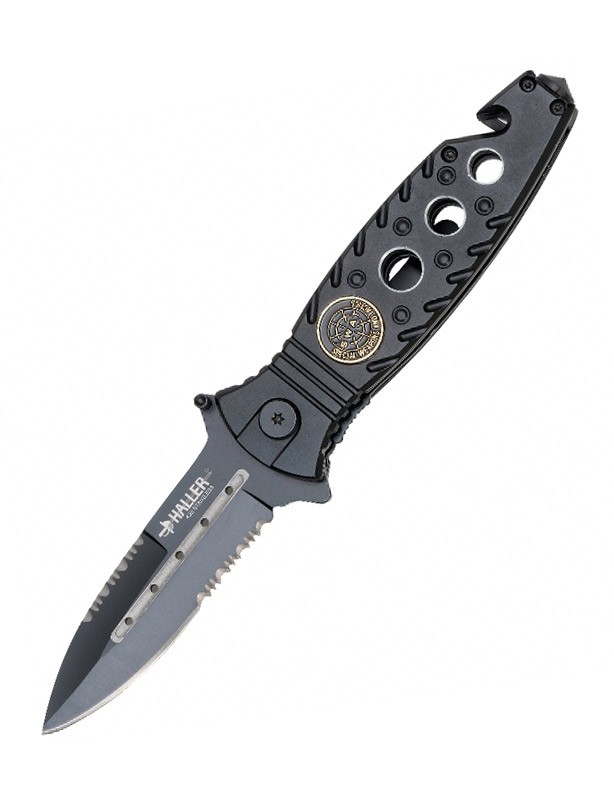 Lame en acier inoxydable 420 revêtu de noir avec bord en dents de scie.