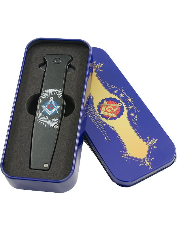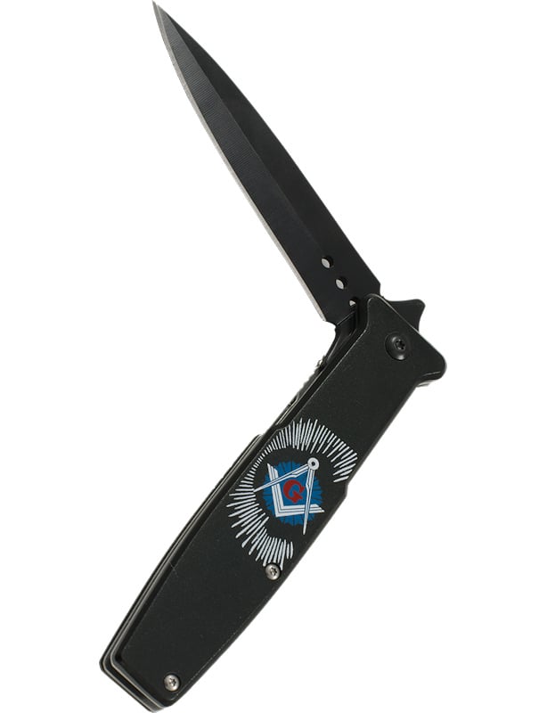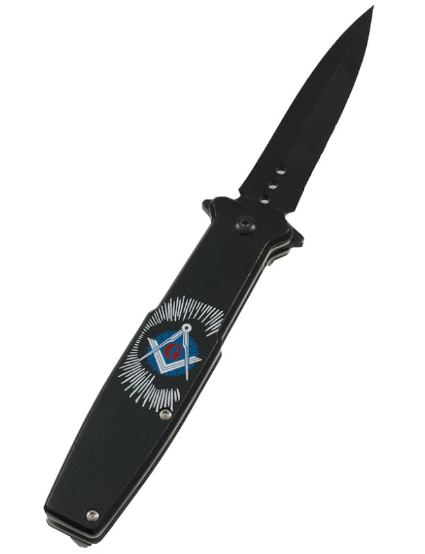 Couteau pliant noir avec des symboles franc-maçon, équerre compas et la lettre G.