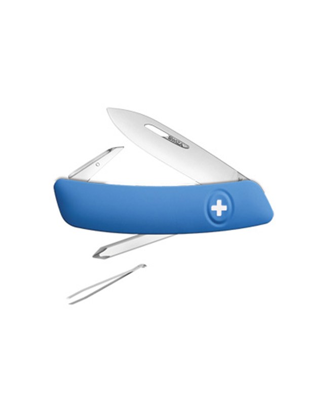 Couteau 6 fonctions: lame 75 mm avec blocage de sécurité, Alêne coupante avec poinçon, Aiguille à Chas, Tournevis Philips n°1-3, Pincette. Blocage de sécurité par la croix.
