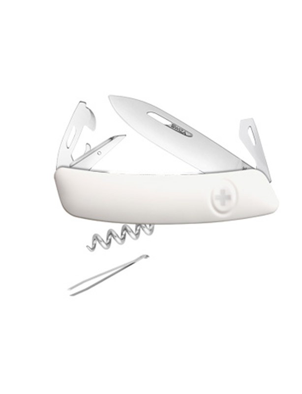 Couteau 11 fonctions : Lame de 75mm avec blocage de sécurité, Alêne coupante avec poinçon, Aiguille à Chas, Décapsuleur avec un tournevis n°3 et un plioir à fil, Ouvre-boîtes avec tournevis n°1, Tire-bouchon qualité sommelier, Pincette. Blocage de sécurité par la croix