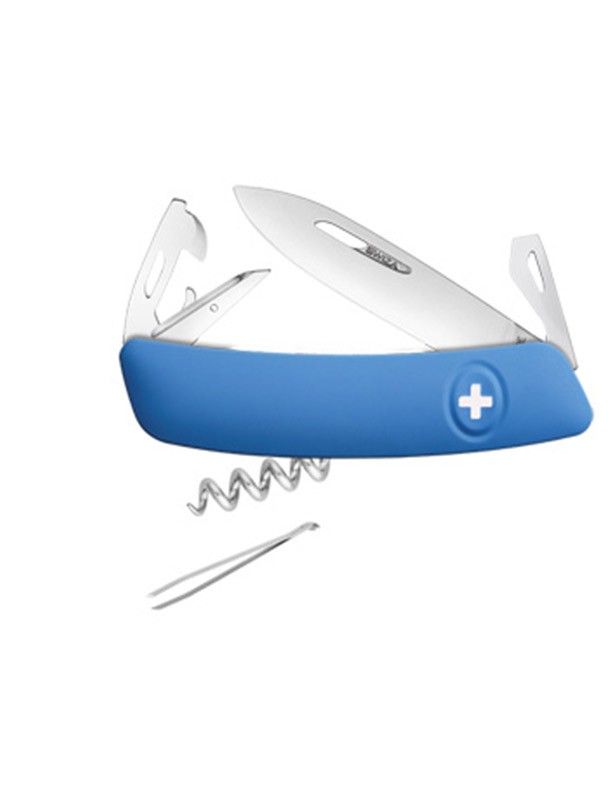Couteau 11 fonctions : Lame de 75mm avec blocage de sécurité, Alêne coupante avec poinçon, Aiguille à Chas, Décapsuleur avec un tournevis n°3 et un plioir à fil, Ouvre-boîtes avec tournevis n°1, Tire-bouchon qualité sommelier, Pincette. Blocage de sécurité par la croix