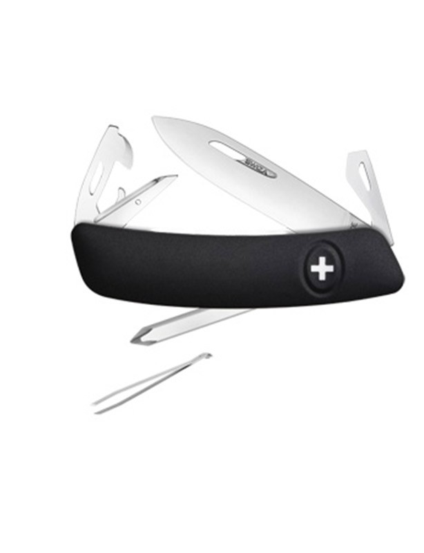 Couteau 11 fonctions : Lame de 75mm avec blocage de sécurité, Alêne coupante avec poinçon, Aiguille à Chas, Décapsuleur avec un tournevis n°3 et un plioir à fil, Ouvre-boîtes avec tournevis n°1, Tournevis Philips n°1-3, Pincette. Blocage de sécurité par la croix