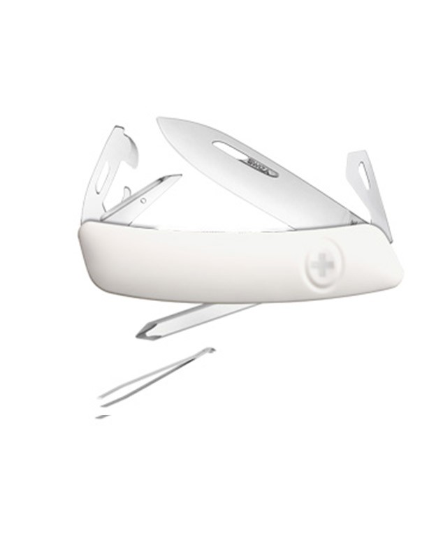Couteau 11 fonctions : Lame de 75mm avec blocage de sécurité, Alêne coupante avec poinçon, Aiguille à Chas, Décapsuleur avec un tournevis n°3 et un plioir à fil, Ouvre-boîtes avec tournevis n°1, Tournevis Philips n°1-3, Pincette. Blocage de sécurité par la croix