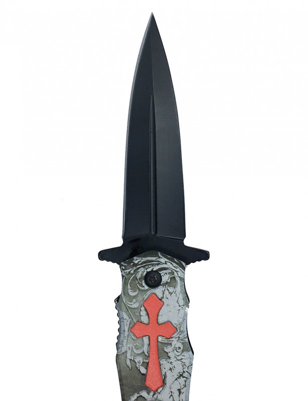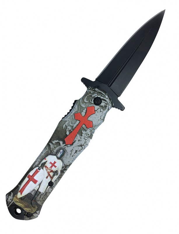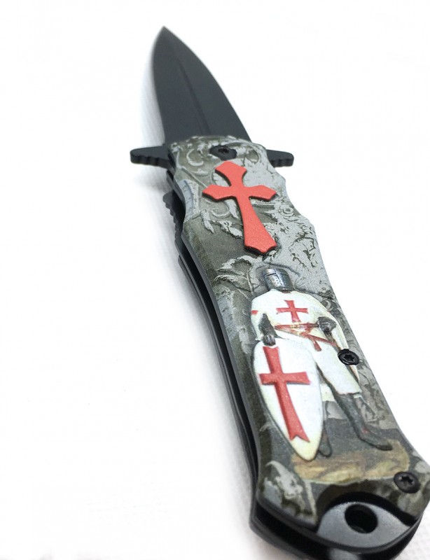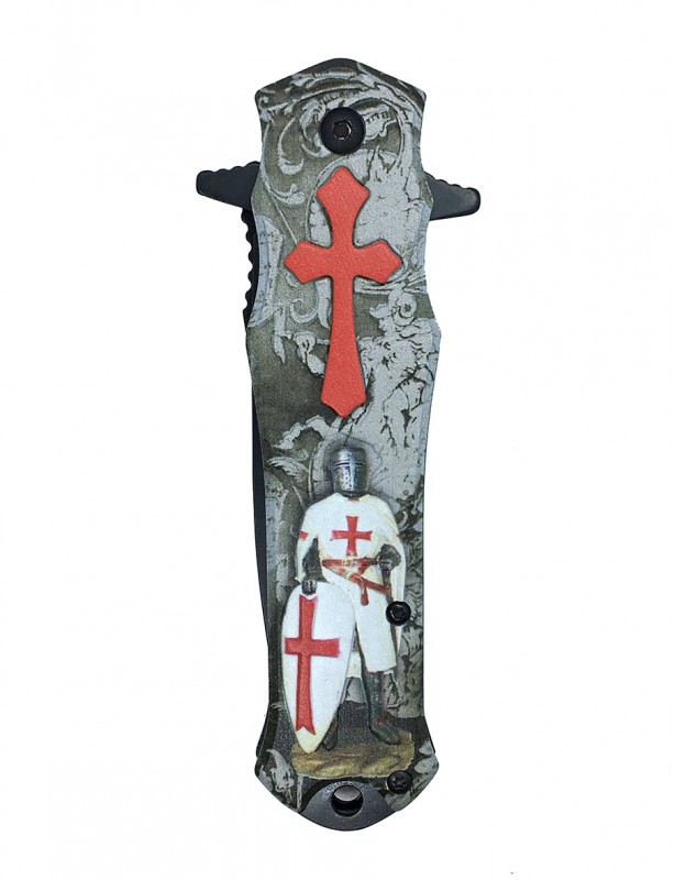 Couteau pliant de poche avec croix Templiers et Chevalier en relief. Le métal utilisé pour ce couteau offre un très bon équilibre entre la solidité et la résistance à la corrosion.