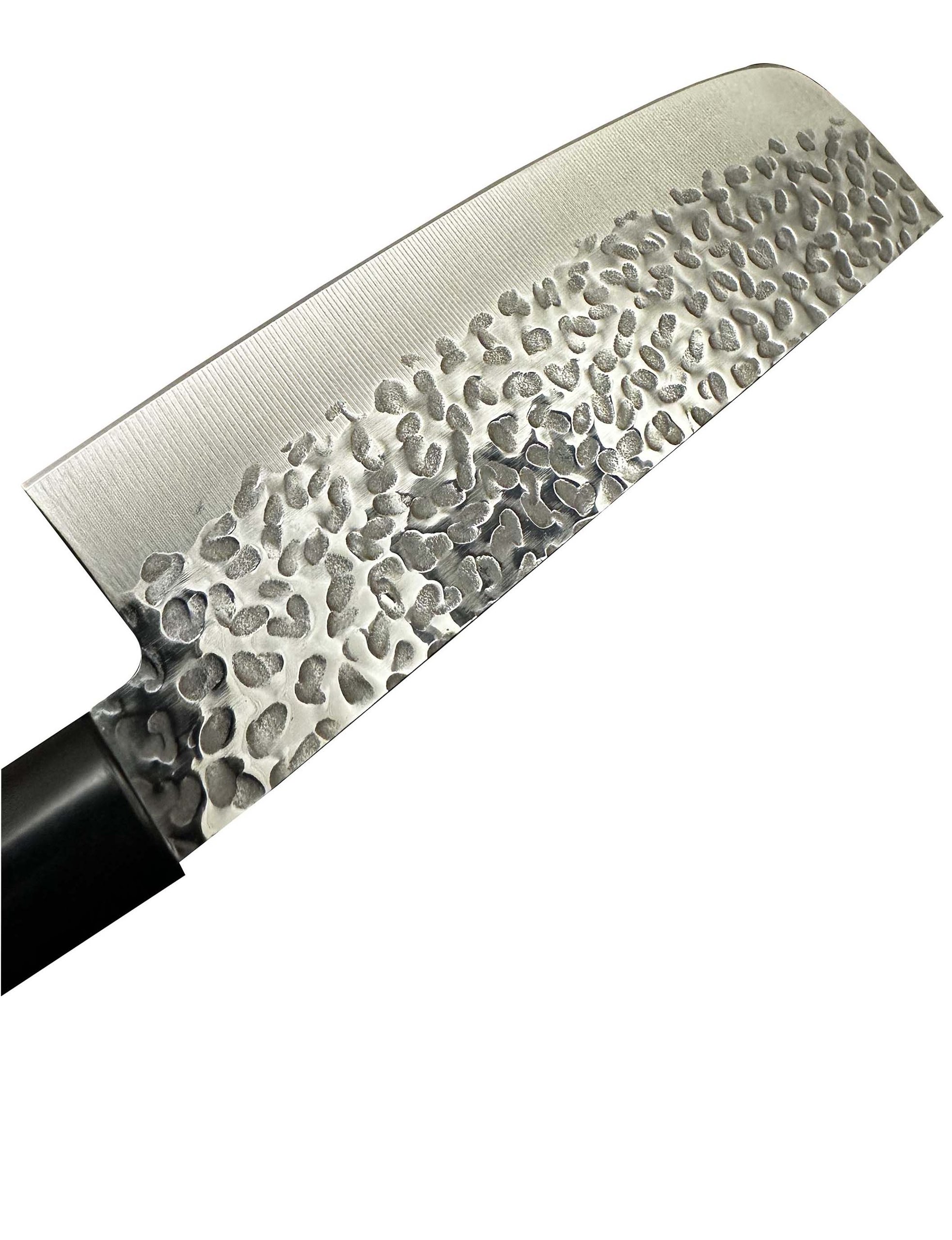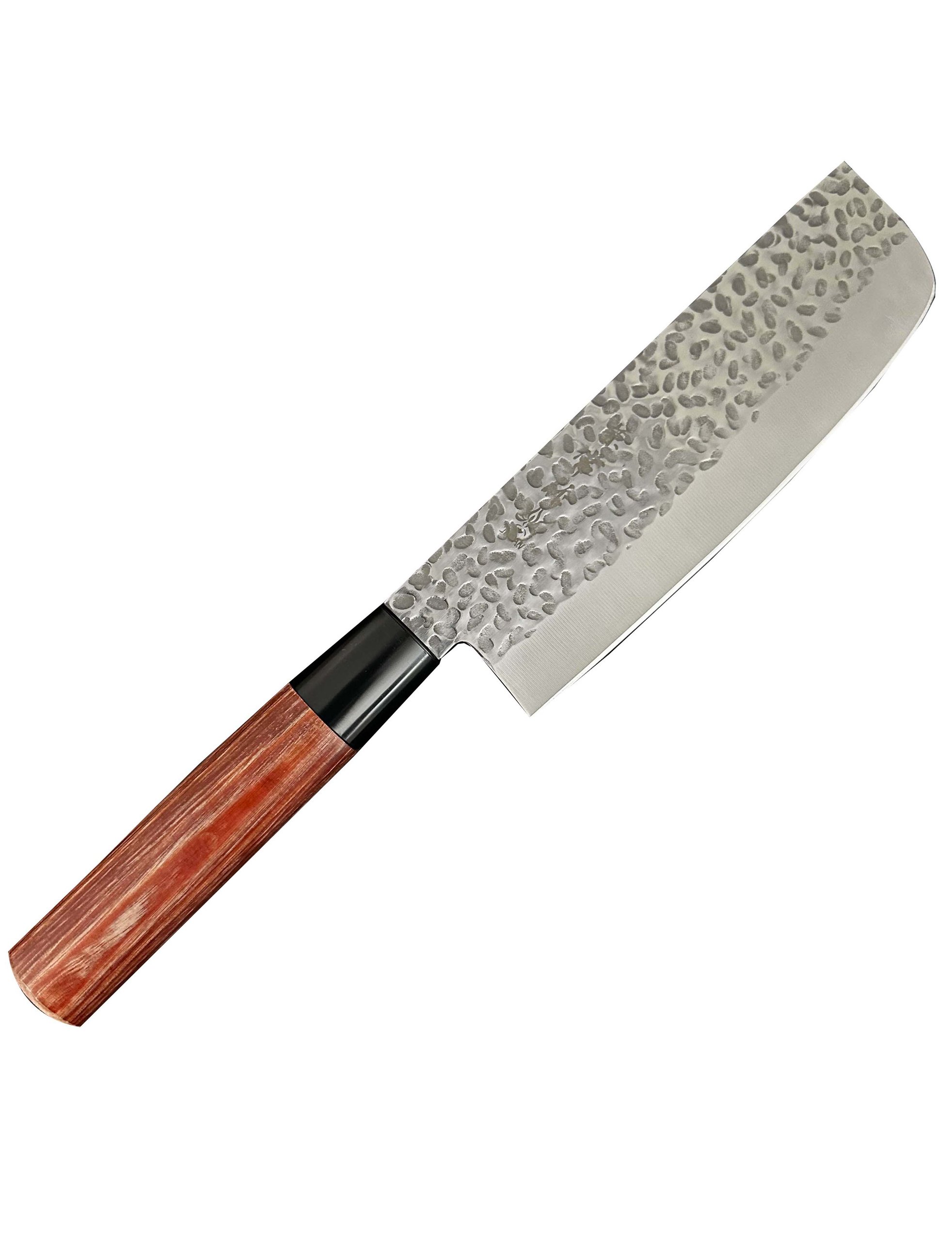 La lame martelée n’est pas seulement esthétique, elle réduit également les frictions, empêchant les aliments de coller à la lame, ce qui facilite la coupe. Le profil Usuba de la lame est spécialement conçu pour les coupes verticales, parfait pour les tâches de découpe et d’éminçage.