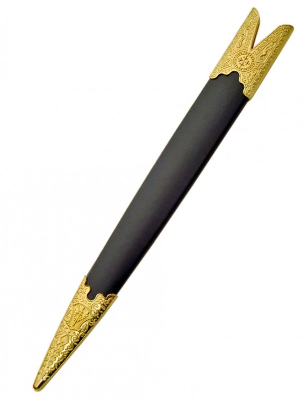 La dague est livrée avec un fourreau en bois recouvert de cuir synthétique noir, agrémenté d’un ornement en métal doré, idéal pour la protection et la présentation.