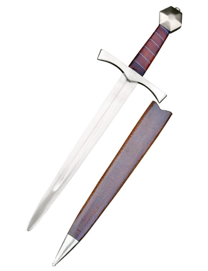 Explorez l’authenticité avec notre Dague Médiévale forgée, idéale pour les reconstitutions historiques. Sa lame en acier carbone, épaisse et non tranchante, assure une sécurité optimale. Le pommeau hexagonal en acier ajoute une touche distinctive. Le fourreau en cuir de qualité protège la dague avec élégance.