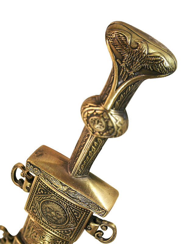 - Symboles décoratifs : Les gravures ornant cette dague représentent des symboles puissants de l’Empire romain, tels que le lion, l’aigle impérial, ainsi que Romulus et Rémus, les fondateurs légendaires de Rome. Ces éléments décoratifs enrichissent la signification historique de l’objet et accentuent son authenticité.
