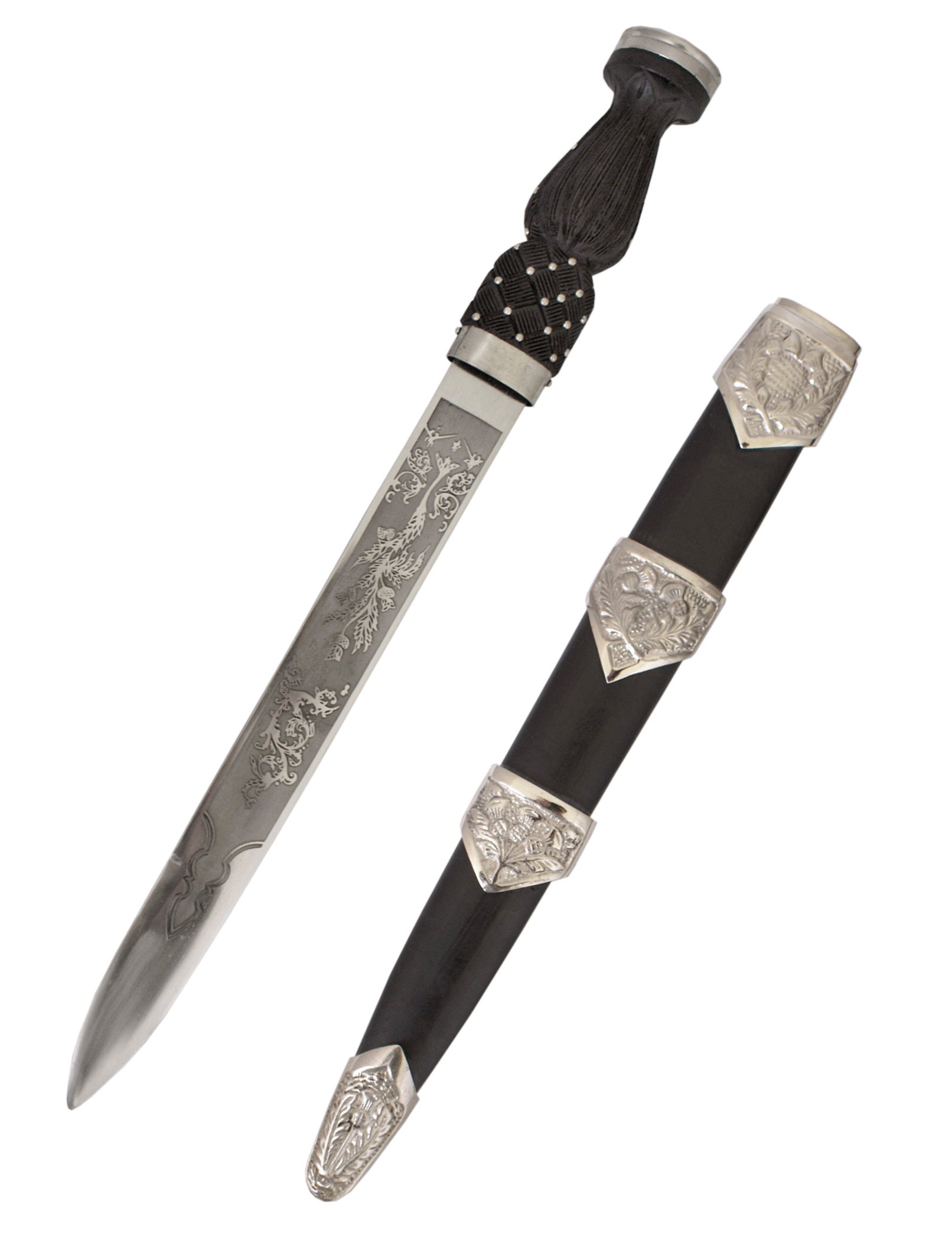 Ce long dirk présente des gravures croquantes du motif traditionnel de feuillage et de chardon écossais des deux côtés de la lame.