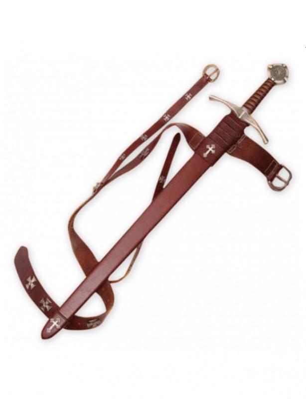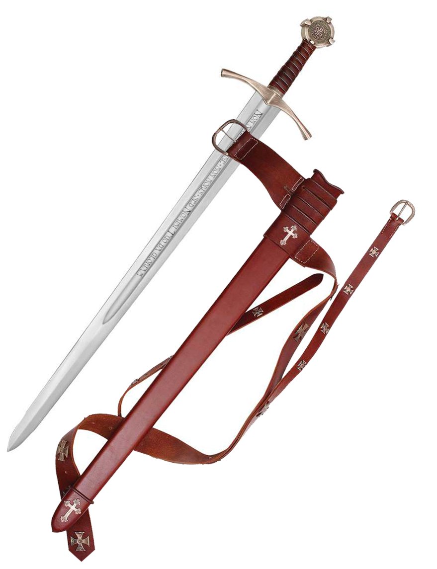 Epée templière avec fourreau et lame gravée des mots emblématiques: