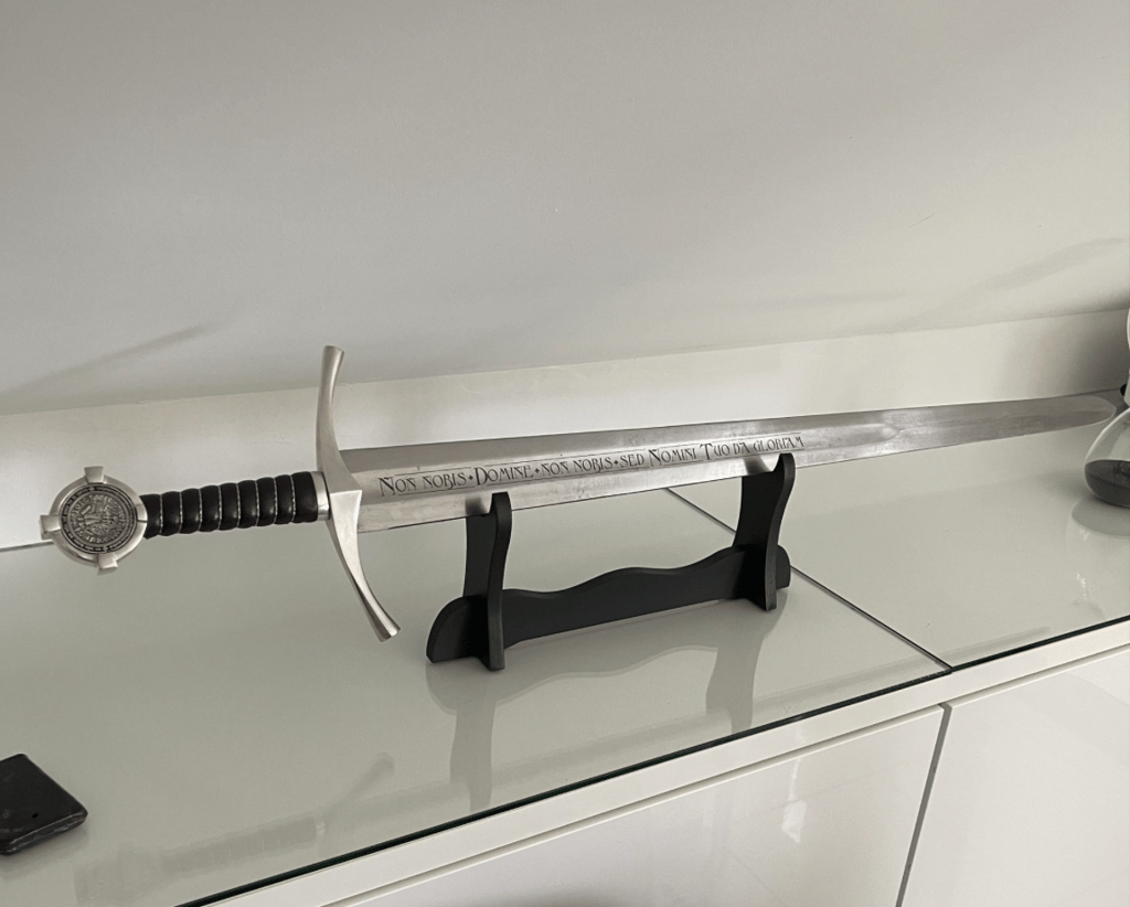 Ces mots emblématiques gravés sur la lame définissent cette réplique d’épée historique,le credo des templiers. Cette magnifique épée nommée L’Accolade aurait été une épée digne du Grand Maître des chevaliers, membre loyal de ce saint ordre.