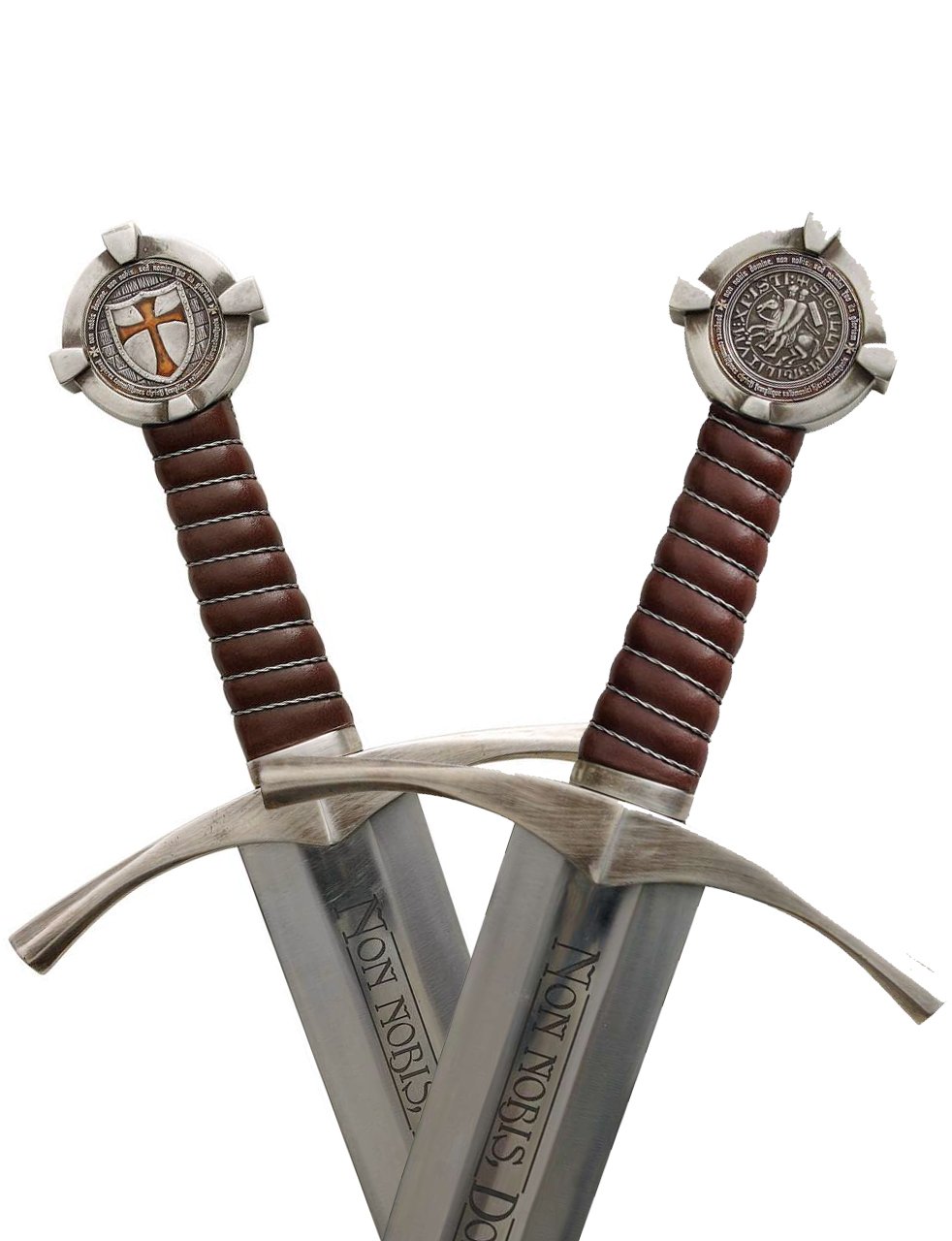 Lame en acier inoxydable polie non tranchante. De chaque côté du pommeau est enchâssé une pièce de monnaie de l’ordre des templiers avec inscription latine et symboles.