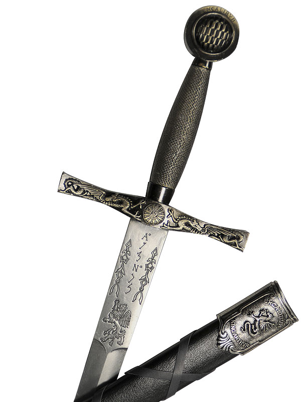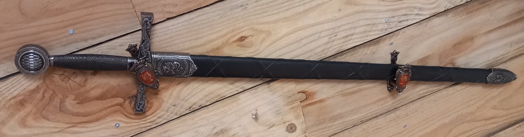 - Largeur de la garde : 19,5 cm, ornée de détails travaillés, rappelant le style médiéval et les légendes arthuriennes.
