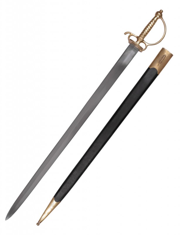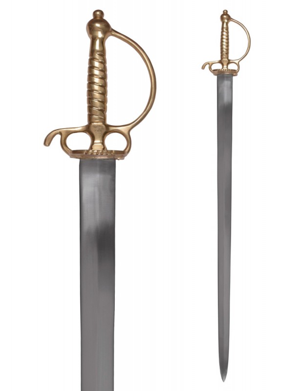 Epée de cour avec fusée et monture en laiton ciselé à décor torsadé. Garde à une branche, pas d’âne et coquille bivalve. Lame triangulaire . Réplique de l’Epoque Louis XVI.