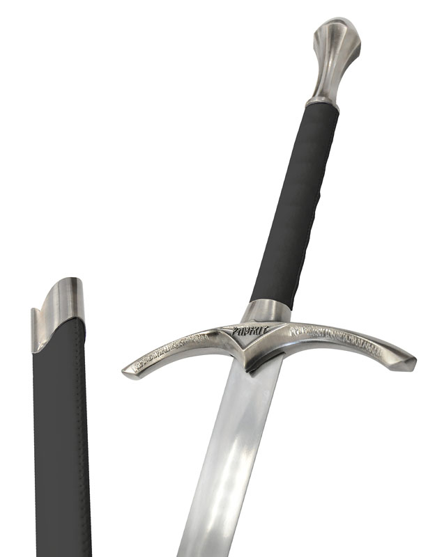 Épée de décoration en acier inoxydable et cuir synthétique noir, avec écritures elfiques sur la garde.