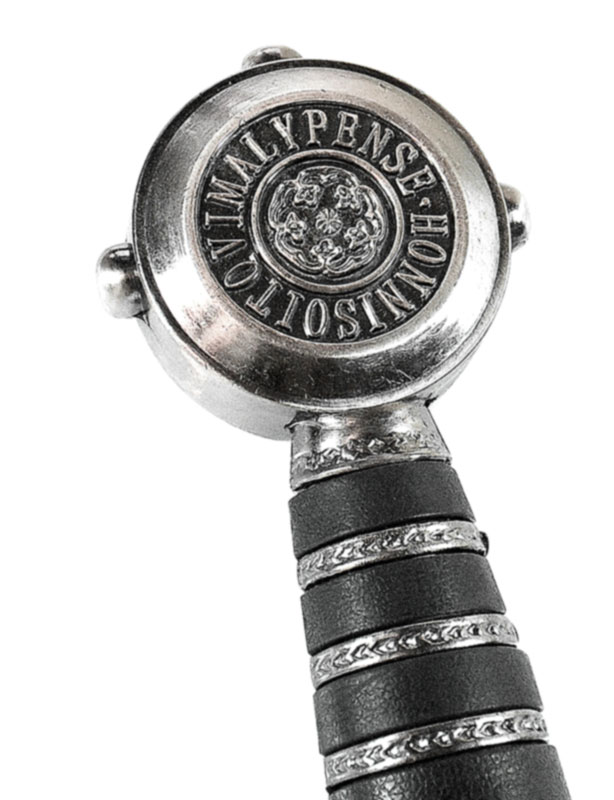 Texte sur le pommeau : « HONNISOITQVIMALYPENSE » (Hon(n)i soit qui mal y pense) plus précisement, Le verbe honnir signifie « blâmer quelqu’un en lui faisant honte et en le vuant au mépris public. Dans un registre moderne, la phrase signife donc « Honte à celui qui voit du mal »