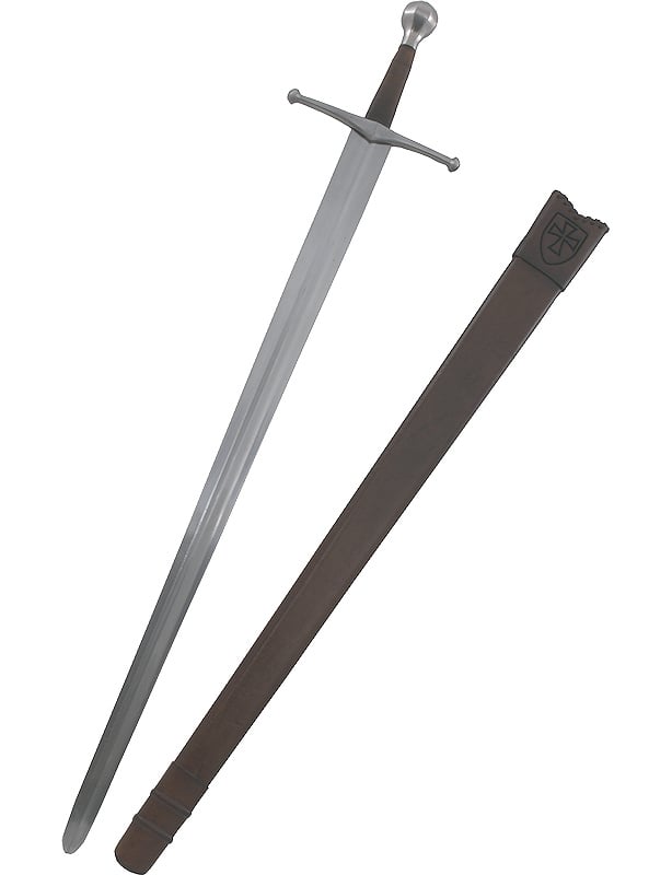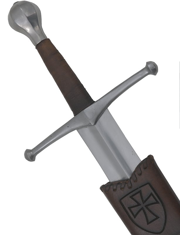 Fabriquée en acier forgé, la lame de 76 cm assure robustesse et résistance, tandis que la poignée en cuir marron garantit une prise confortable et authentique. L’épée est livrée avec un fourreau en cuir brun, orné d’une gravure d’une croix pattée dans un blason, ce qui en fait une pièce idéale pour la collection ou l’exposition.