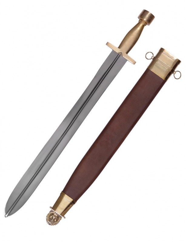 Epée courte hoplite. Son statut est clairement secondaire. L'escrime à proprement parler n'existe guère en Grèce et le grec parle de conquête « par la lance » là où le français dirait « par l'épée ». Elle est généralement courte environ 60 cm. Celle des Spartiates est réputée pour être particulièrement courte : les autres Grecs la raillent comme une « épée de jongleur »