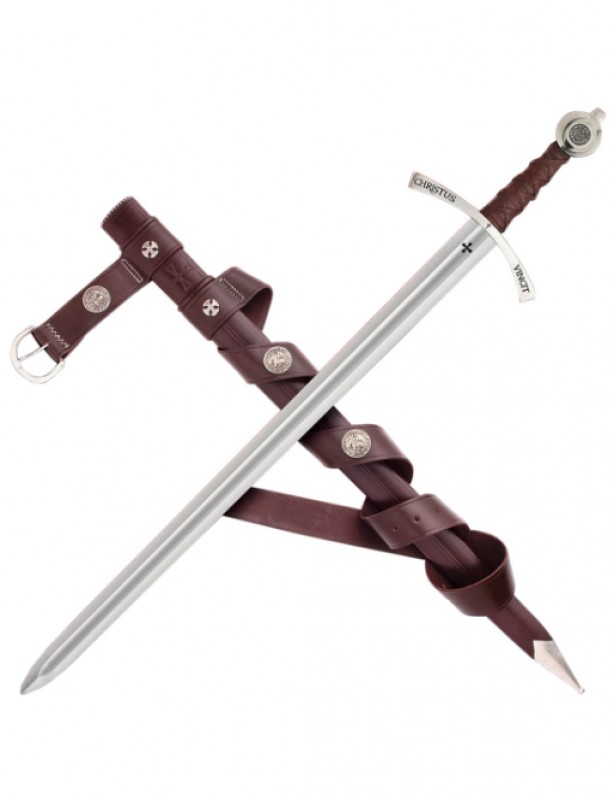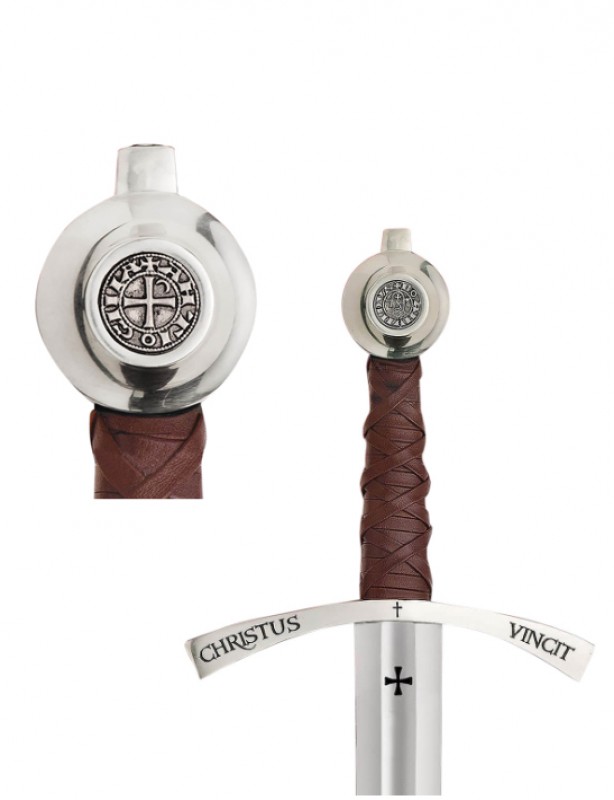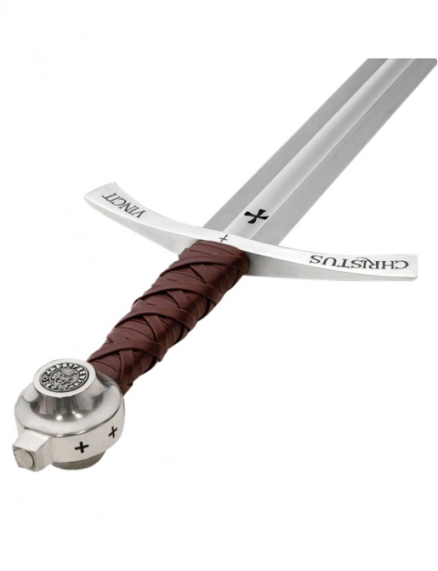La poignée est recouverte de cuir véritable, offrant une excellente ergonomie et un rendu noble. Les pièces en acier massif, entièrement fabriquées à la main, soulignent la robustesse de l’ensemble. Le pommeau est orné d’une pièce incrustée en hommage à Bohémond II d’Antioche, figure emblématique des croisades. La garde porte, de chaque côté, l’inscription latine Christus Vincit – Christus Regnat, affirmant la suprématie spirituelle du Christ, cœur de l’engagement templier.