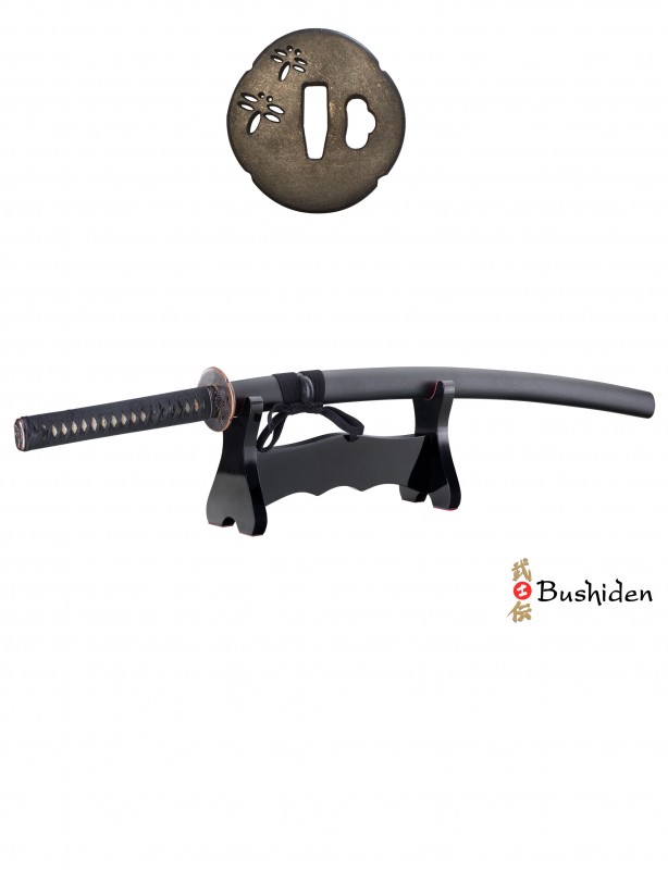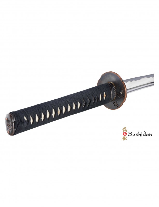 2 Menuki: Laiton avec revêtement de surface noir. Un de chaque coté, montés de manière traditionnelle.