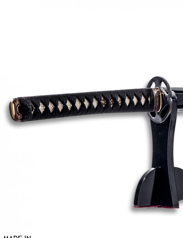 - Poignée (Tsuka) : Bois recouvert de peau de raie synthétique, enveloppée de coton noir ajusté.