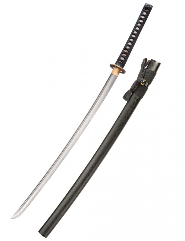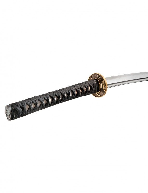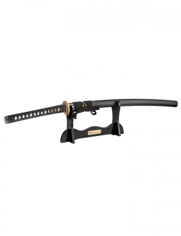 Forgée main, lame courbe avec Bohi (gouttière) et Chu-Kissaki (pointe). Acier inox, le Hamon sur la lame est fait par technique de sablage. La dureté du Mune et du Ha (tranchant de la lame) est de 55 HRC Rockwell. Lame non tranchante.