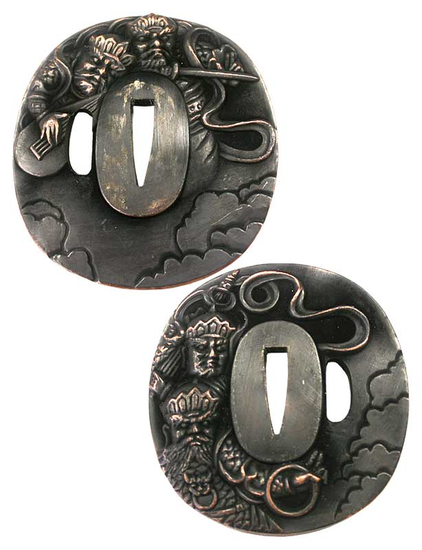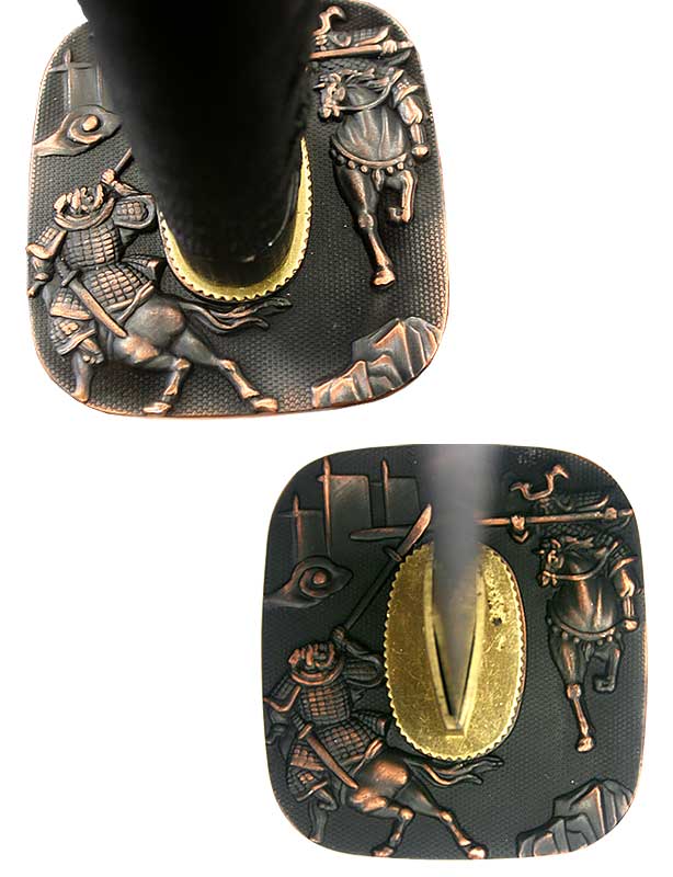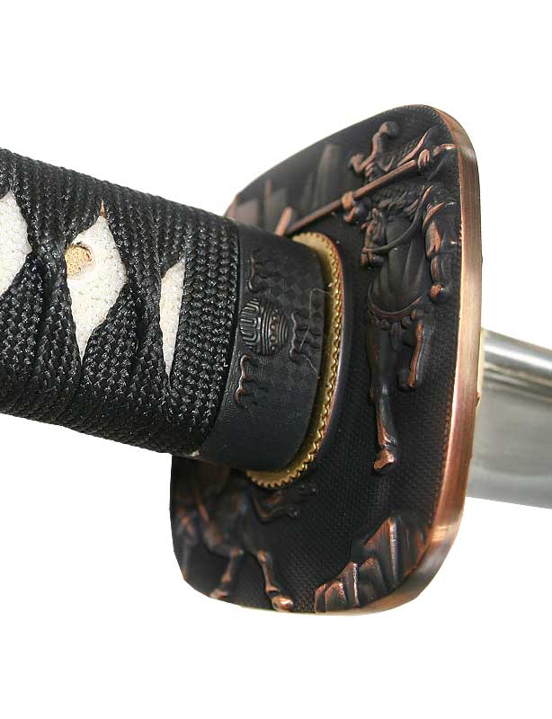 - Tsuba: Métal moulé, cuivré et noirci, livré avec deux tsubas interchangeables (7 x 8 cm).
