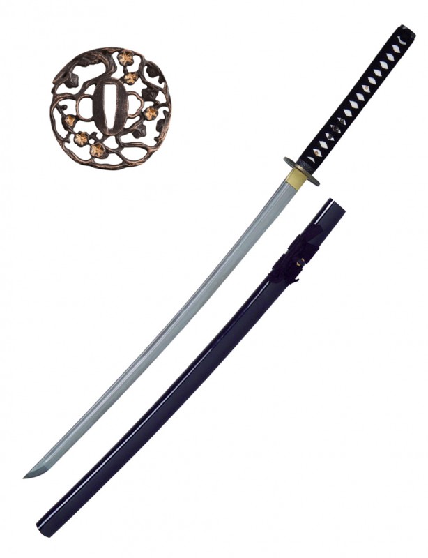 - Design Élégant : Saya laquée noire et Tsuka en coton noir avec Tsuba au motif floral pour une esthétique raffinée.