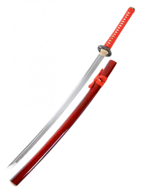 - Saya en bois laqué rouge : Le fourreau laqué rouge sang incarne la force et l’intensité de cette arme légendaire.