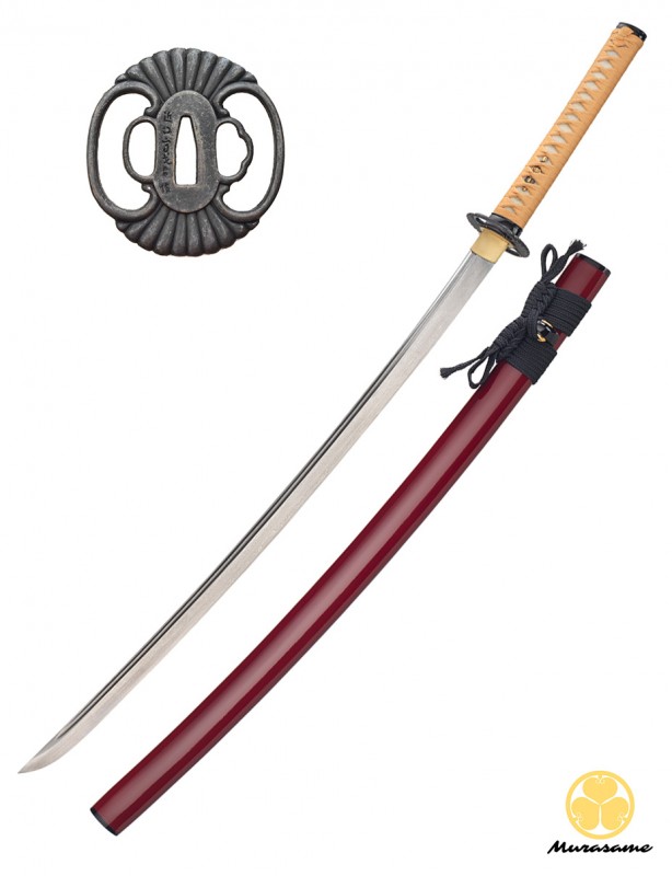 Forgée main, lame courbe avec Hi (gouttière) et Chu-Kissaki (pointe). Acier 1060 plié. La dureté du Mune et du Ha (tranchant de la lame) est de 55° HRC Rockwell. Le dos de la lame est iori-mune, le tranchant est sans Niku. (Lame très coupante).