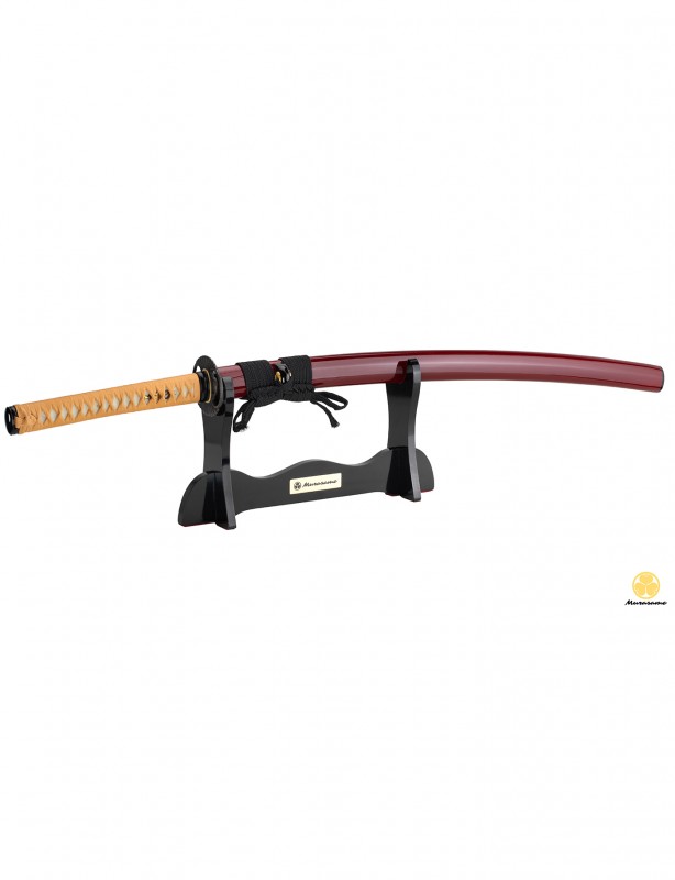 Saya (Fourreau): Bois sélectionné. Laqué Rouge bordeau. Courbé selon le Sori de la lame.