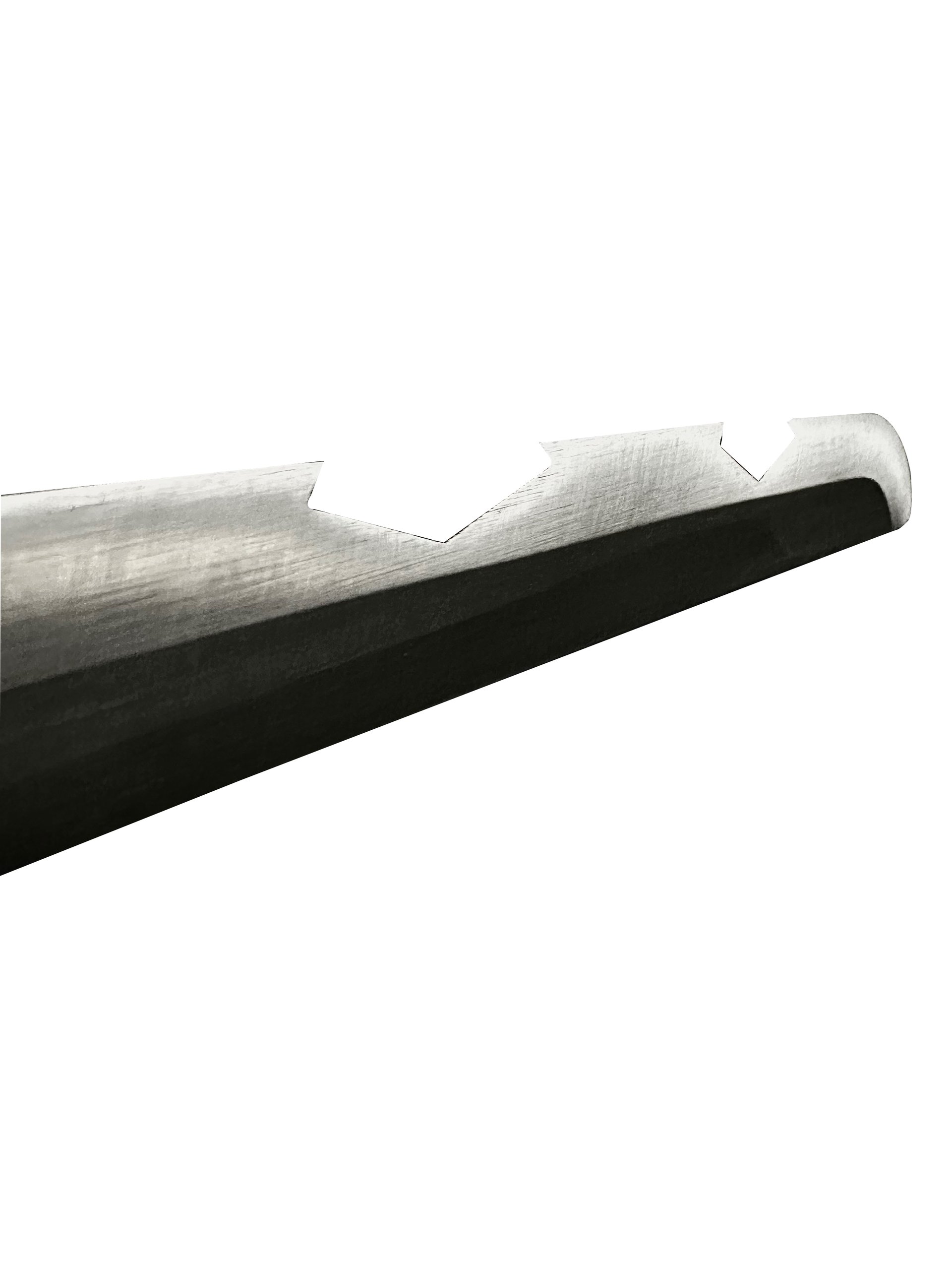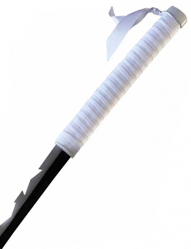 Réplique de l’arme Inosuke Hashibira, qui est sabre particulier puisqu’il dispose d’une lame dentelée, sa lame est en acier carbone non tranchante, le fourreau est en simili cuir blanc avec une lanière pour le porter dans le dos.