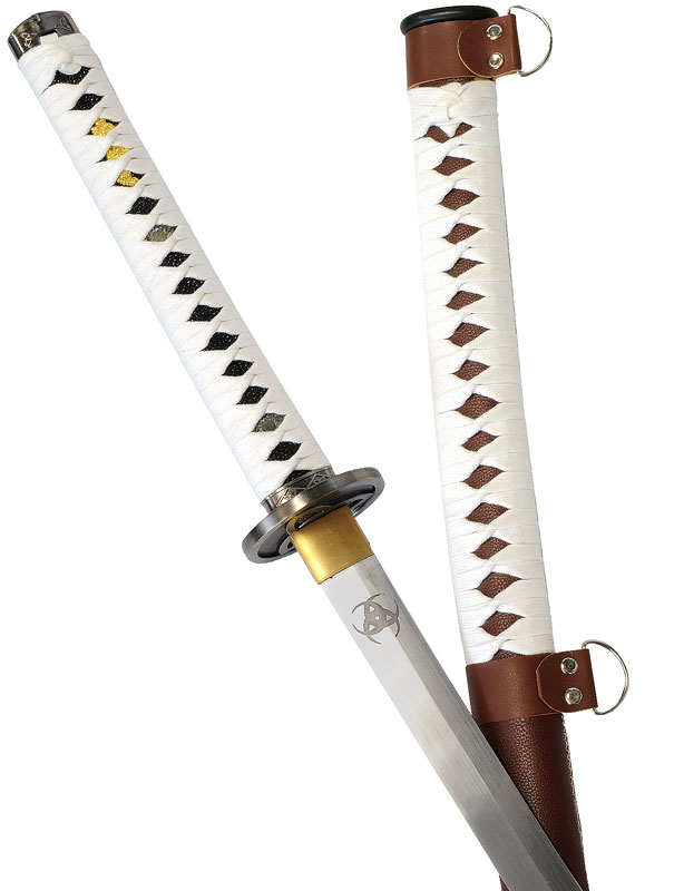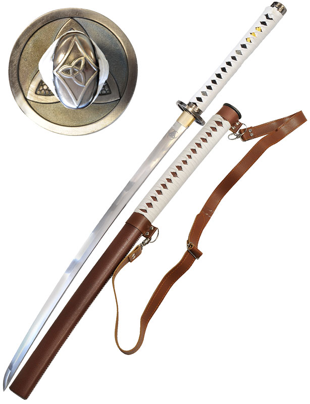 Les tressages sont en coton blanc, une bandoulière est également accrochée pour porter le katana.