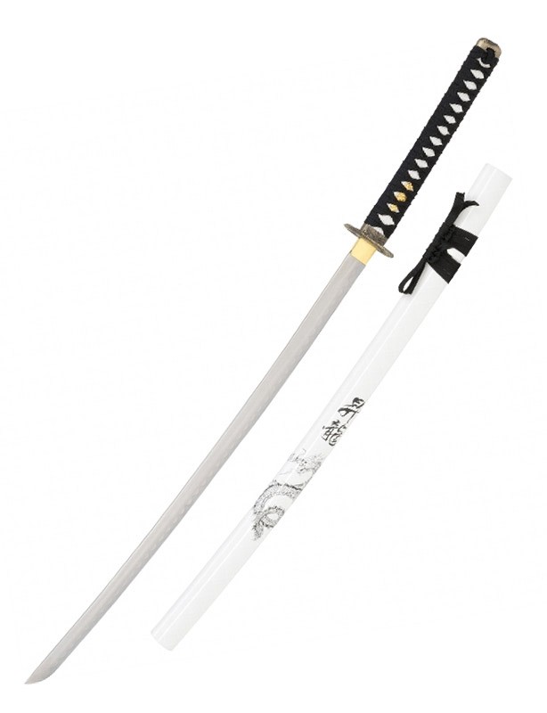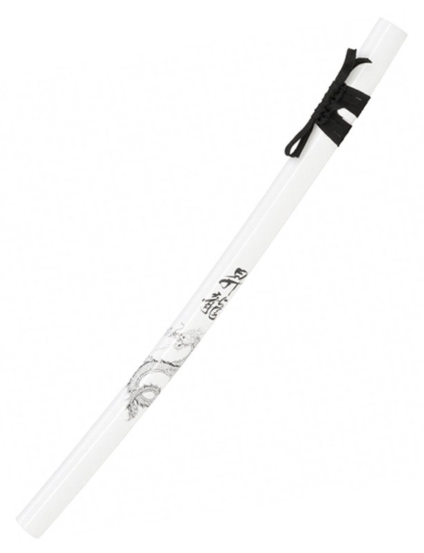 Au Japon on lui le nom de ryū ou tatsu (龍 ou 竜), sur ce sabre le dragon est peint en noir sur le saya blanc laqué ce qui donne un rendu sobre et élégant.