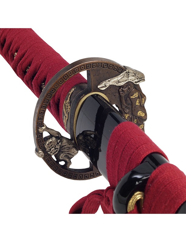 Sa poignée (tsuka) de 29 cm, recouverte de galuchat véritable et tressée d’un ito rouge en coton Hinerimaki, offre une prise ferme et confortable. La saya (fourreau) en bois laqué noir protège la lame et renforce le contraste visuel avec le rouge profond du tressage. Le tsuba (garde) de 8 cm, finement ouvragé, assure l’équilibre parfait entre la lame et la poignée.