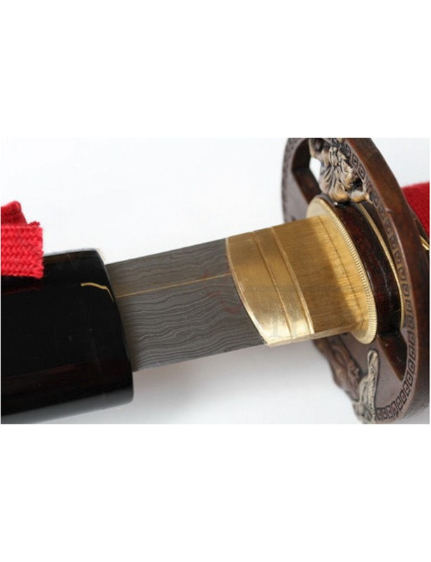 Ce katana se distingue par une lame damassée de type Shinogi-Zukuri avec Bo-Hi, forgée en acier plié 1045 (0,45 % de carbone). La lame a été pliée douze fois, créant près de 8 000 couches d’acier : un savoir-faire qui améliore à la fois la flexibilité et la résistance, tout en donnant à la surface un motif ondoyant typique du Damas japonais. Cette combinaison de souplesse et de tranchant fait du Katana Kappa une arme idéale pour la pratique du tameshigiri(coupe réelle), tout en restant une pièce d’exposition d’exception.