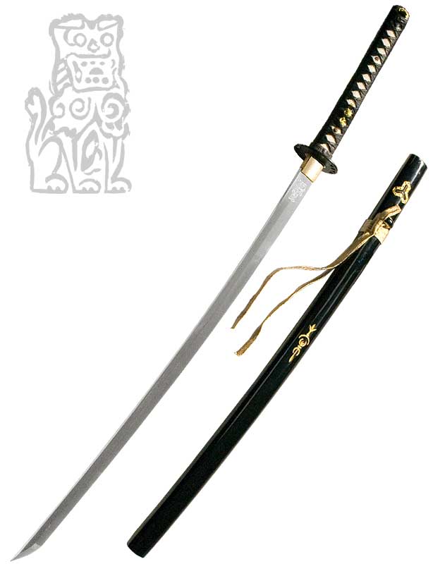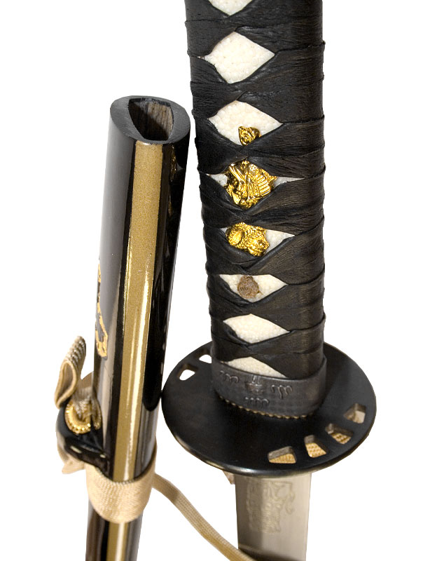 - Ito et Sageo Dorés : Les cordons de montage, le Ito est en Cuir noir et le Sagéo dorés complètent le look luxueux de ce katana.